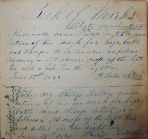 It is a challenge to go through the book. The pages are not numbered and there is no index. The first 30 pages are the estrays, then the earmark registrations begin with the year 1883. After nine pages of earmarks going back in time to 1871 there is a page entitled Book of Marks, which begins with Philip Deutch in 1842. The next entry is Philip Bolton, 1841. Registrations continue in order by year for another 20 pages, through 1870, to the end of the book, where some pages have been torn out.