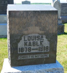 This is the tombstone of Louisa (Alt) Kable, located in row 1 of St. Paul Lutheran Cemetery, Liberty Township, Mercer County, Ohio. The marker is inscribed: