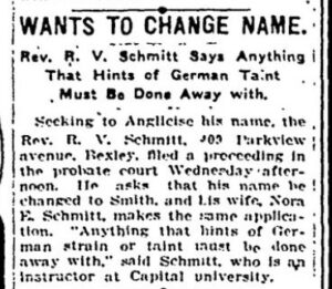 Seeking to anglicize his name, the Rev. R.V. Schmitt, 409 Parkview Avenue, Bexley, filed a proceeding in the probate court Wednesday afternoon. He asks that his name be changed to Smith, and his wife, Nora E. Schmitt, makes the same application. “Anything that hints of German strain or taint must be done away with,” said Schmitt, who is an instructor at Capital university. [Columbus Evening Dispatch, Columbus, Ohio, 27 Jun 1918]